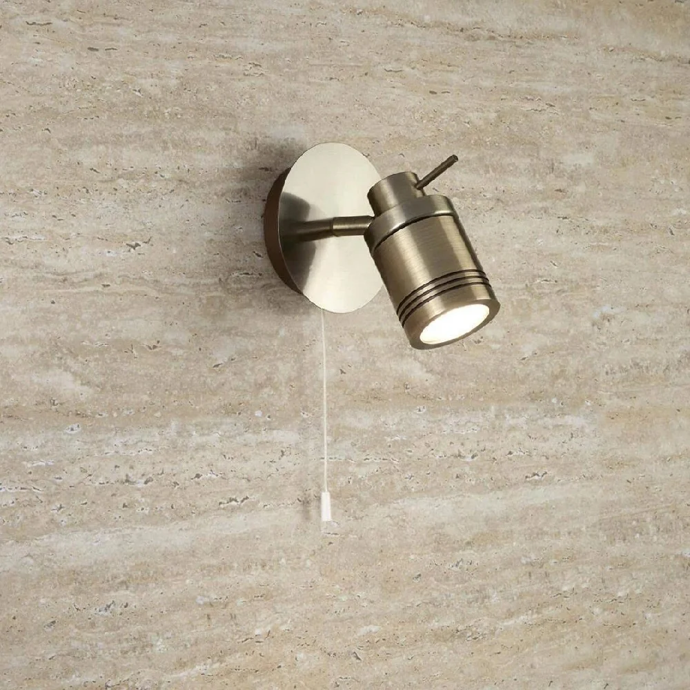 A stunning high grade IP44 bathroom light with a mix of modern and vintage styling. The round fixing plate finished in antique brass connects to the cylinder head via a metal stem. The head itself has grooves and an adjusting arm to give an almost industrial look. Fitted with an on off pull cord switch for isolated use if needed. Can be used as a single light or paired either side of a mirror to balance the room. Rated for bathroom use, but can also be used in outdoor locations.