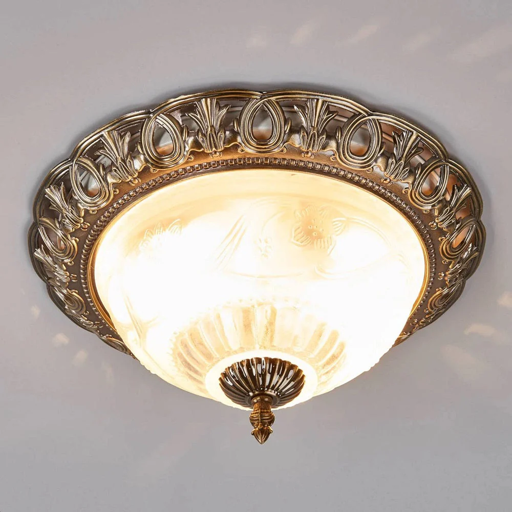 Antique Brass & Frosted Glass Traditional Dome Flush Light 33cm