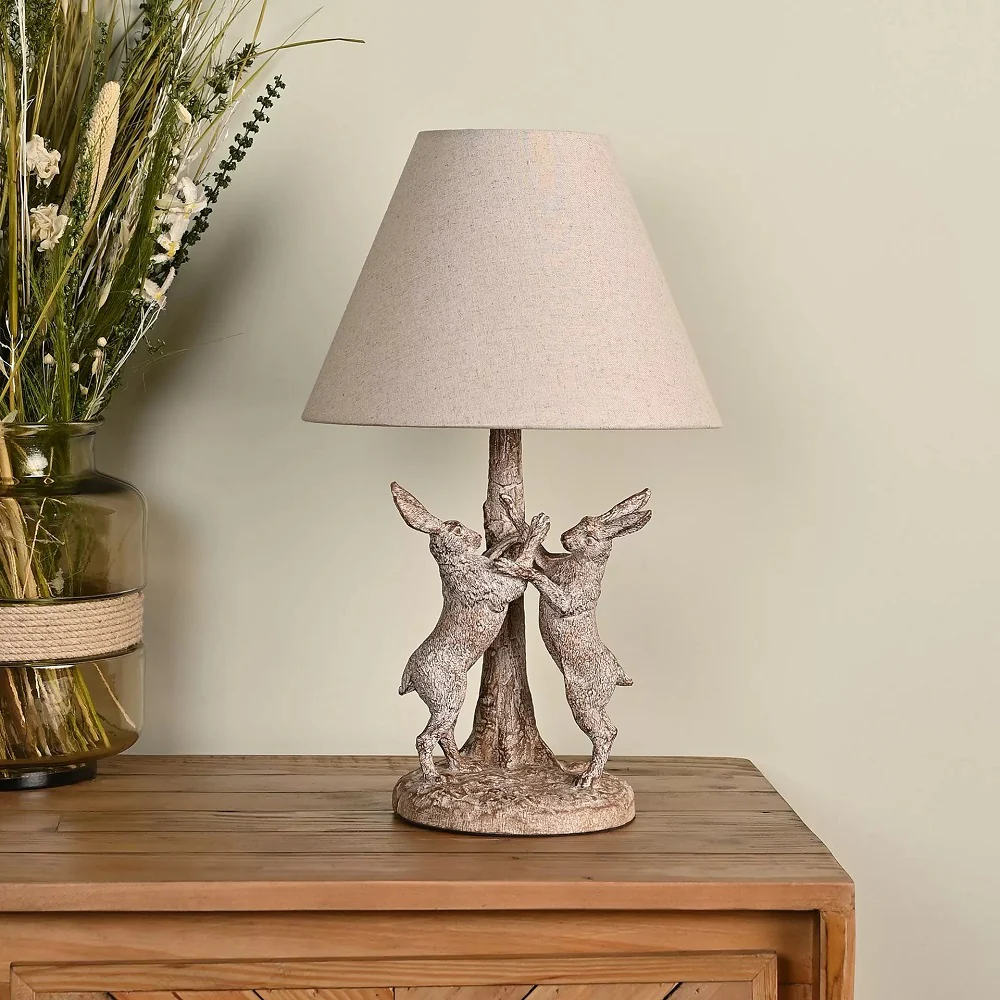 A stunning vintage wood effect resin high definition marching hares (rabbits) table lamp with beige linen tapered drum lampshade. A classic retro design that is perfect for shabby chic, rustic and cottage design tastes. Can be used as a single lamp light or paired to balance the room. A unique table desk lamp design that creates a visual eye catching centre piece for any room. The marching hares sculpture supports the quality shade.