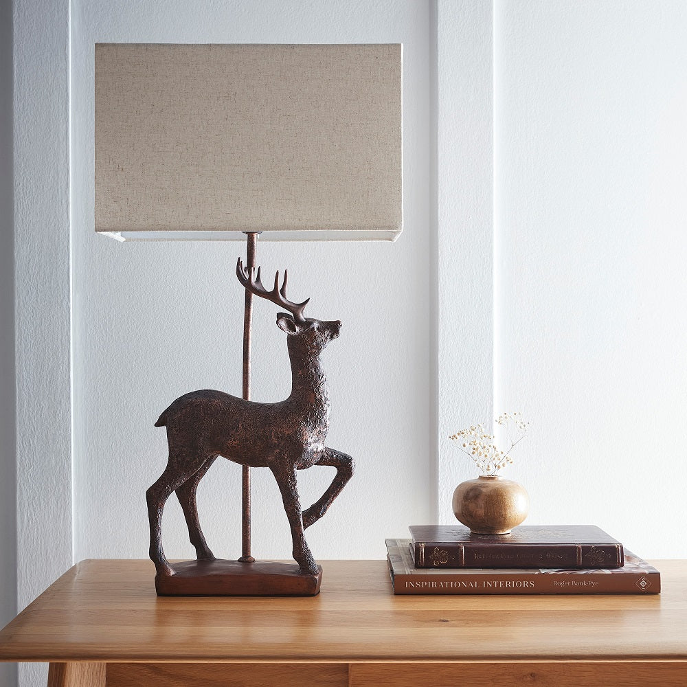 Antique Copper Stag Table Lamp with Natural Linen Rectangular Shade 61cm