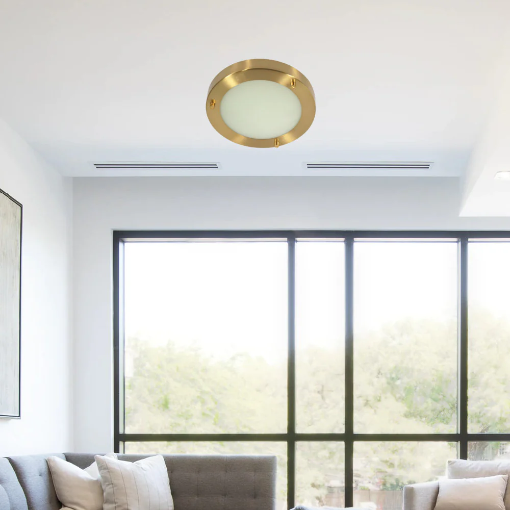 A satin brass bathroom flush ceiling light with a mix of modern day and vintage designs. The opal glass domed glass shade is framed by a satin brass rim that enhances the look of the flush fitting. The frame is fixed in place with the use of three almost industrial looking screws. IP44 rated for bathroom and outdoor use.